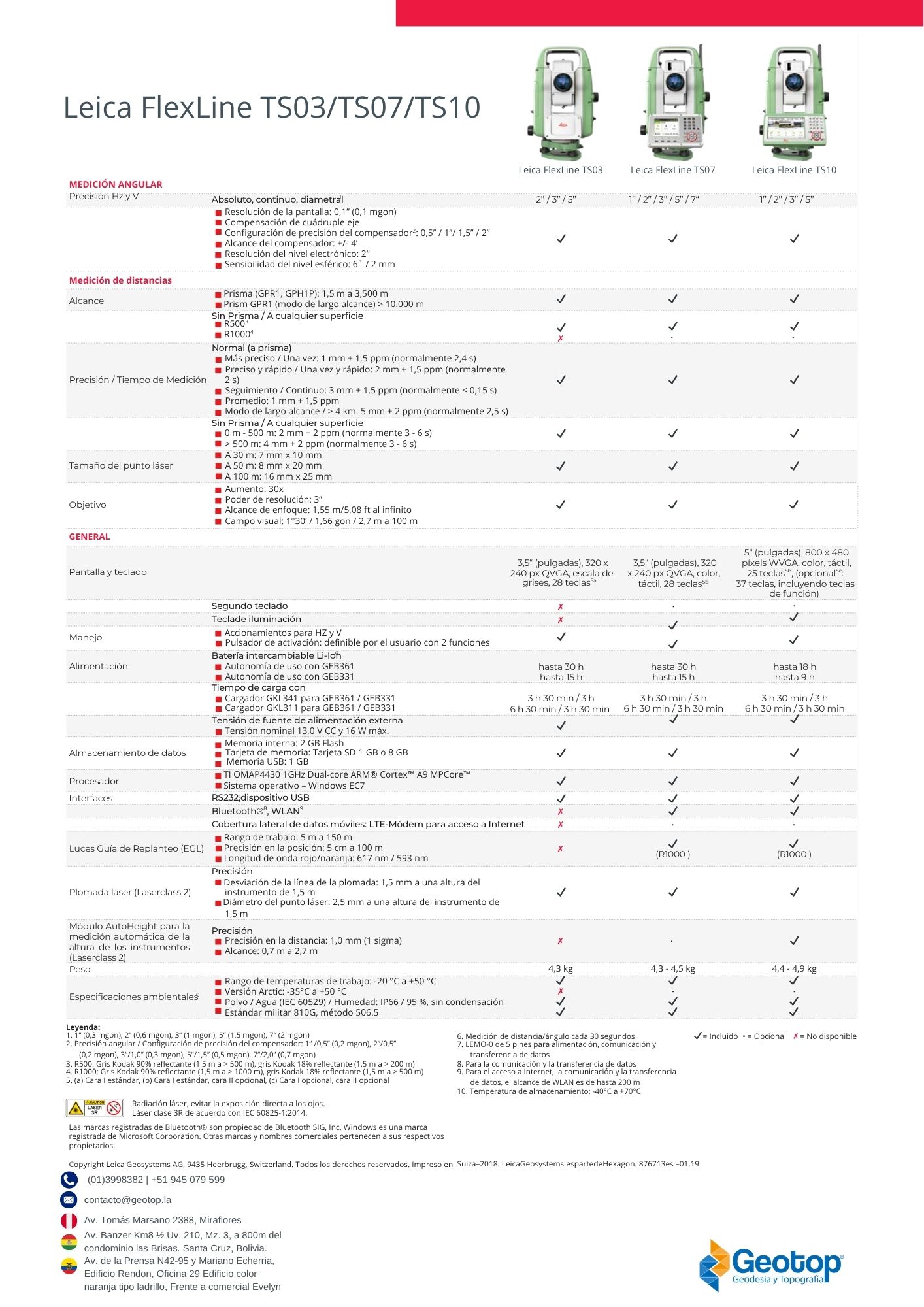 | Precisión Hz y V | Absoluto, continuo, diametral 2’’ – Resolución de la pantalla: 0,1” (0,1 mgon) – Compensación de cuádruple eje – Configuración de precisión del compensador2: 0,5’’ / 1’’ / 1,5’’ – Alcance del compensador: +/- 4’ – Resolución del nivel electrónico: 2“ – Sensibilidad del nivel esférico: 6` / 2 mm |