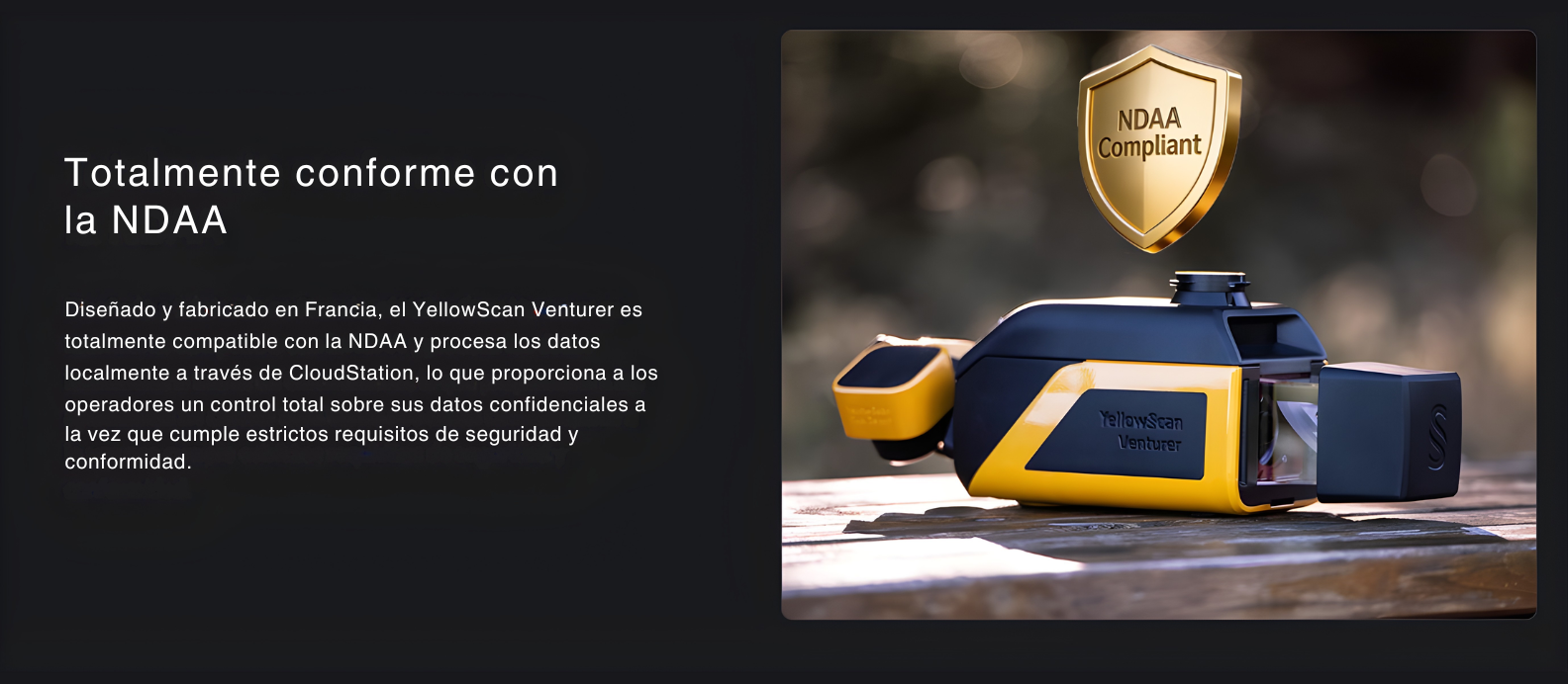 Respaldado por más de una década de experiencia en LiDAR, el YellowScan Venturer se diseñó para responder a las limitaciones reales de la topografía. El YellowScan Venturer es totalmente compatible con la NDAA y procesa los datos localmente a través de CloudStation, lo que proporciona a los operadores un control total sobre sus datos confidenciales a la vez que cumple estrictos requisitos de seguridad y conformidad.